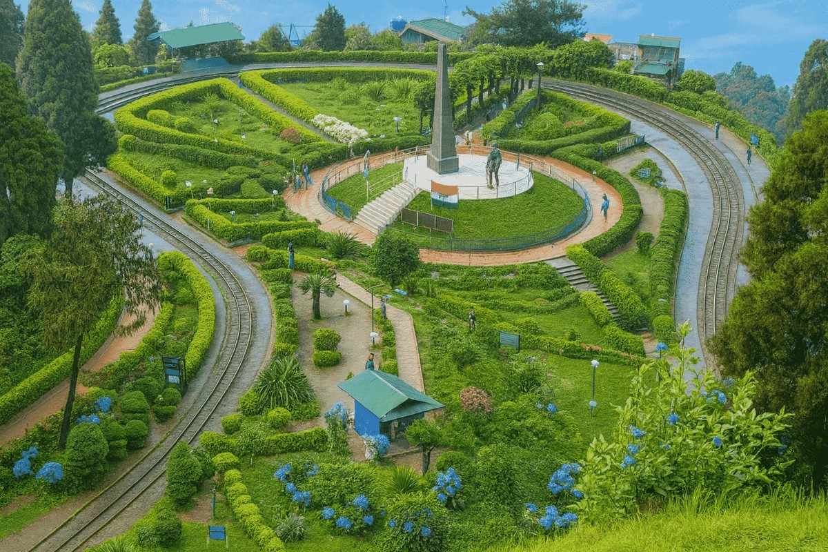 Batasia Loop: Where the Toy Train makes a “U” turn, featuring a beautiful War Memorial garden.